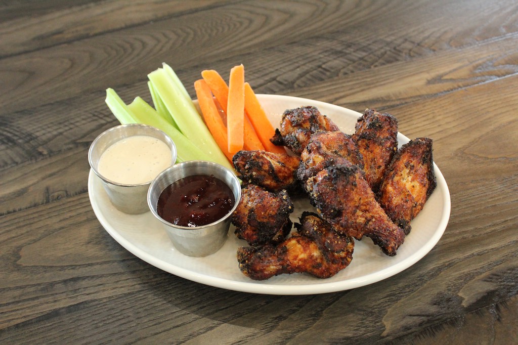 Sweet and spicy chicken wings with housemade bleu cheese, blackberry barbecue sauce, carrots and celery