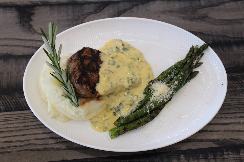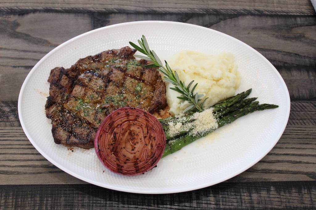 Topped with herb butter and served with a grilled sweet onion, loaded baked potato and grilled asparagus