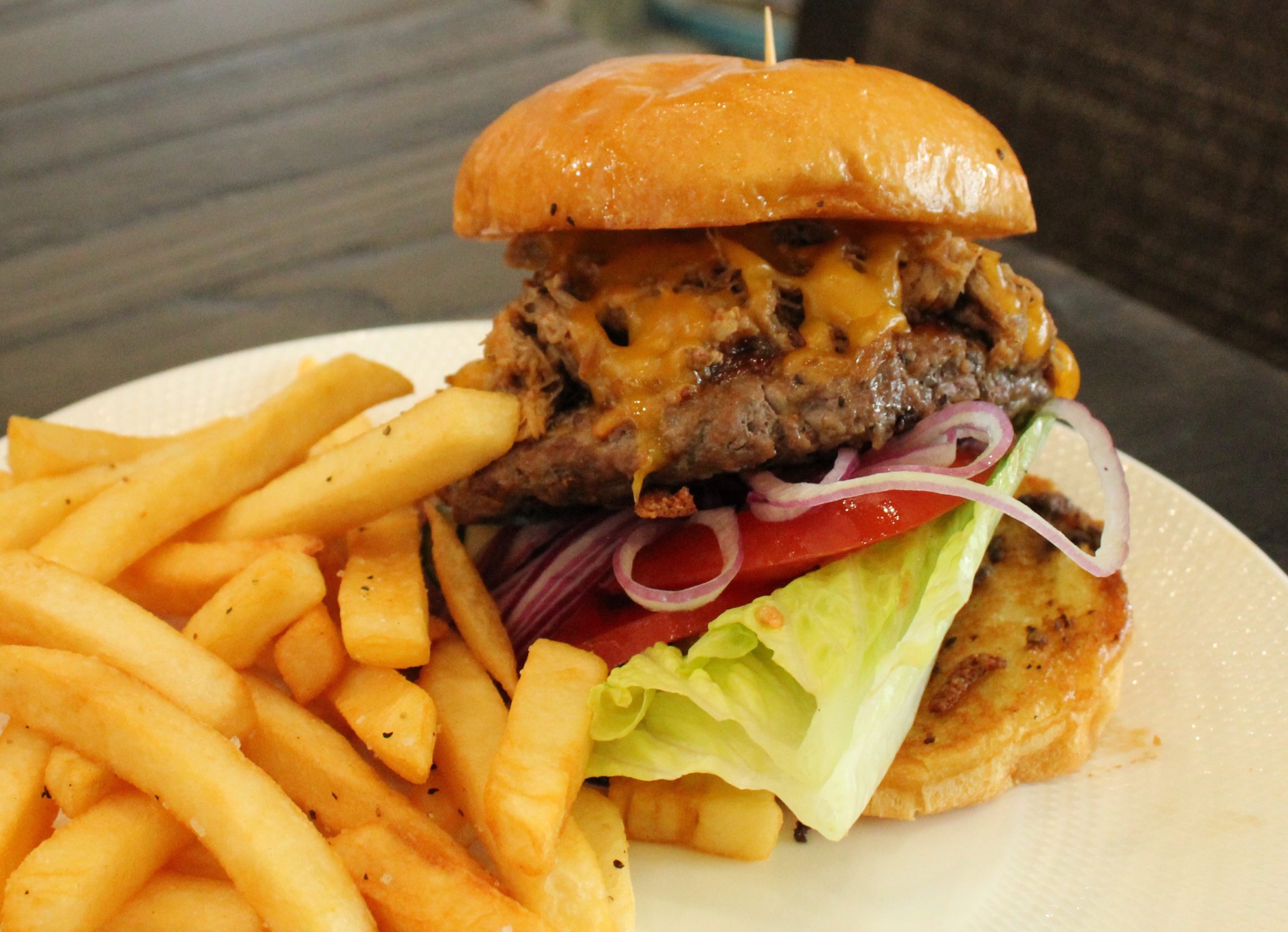 8 oz Angus beef, pork carnitas, blackberry barbecue sauce, cheddar cheese, shaved onions and housemade pickles on a brioche bun