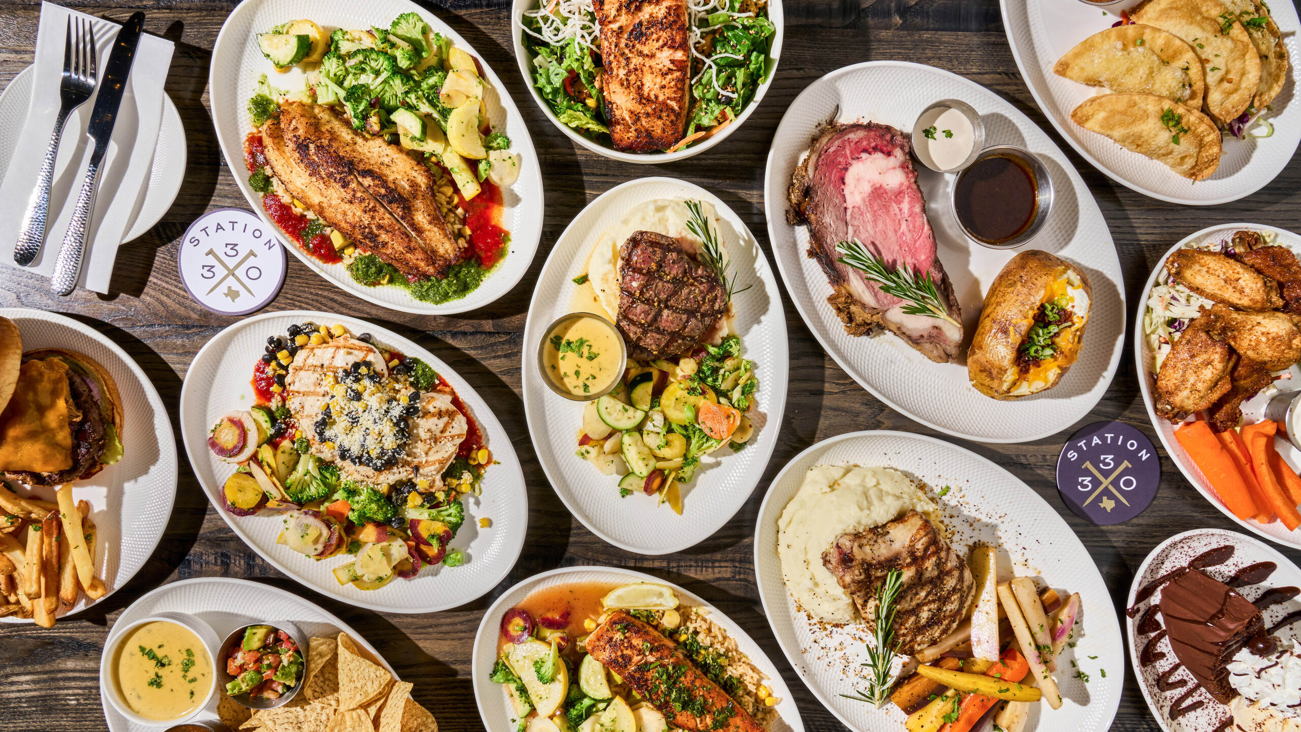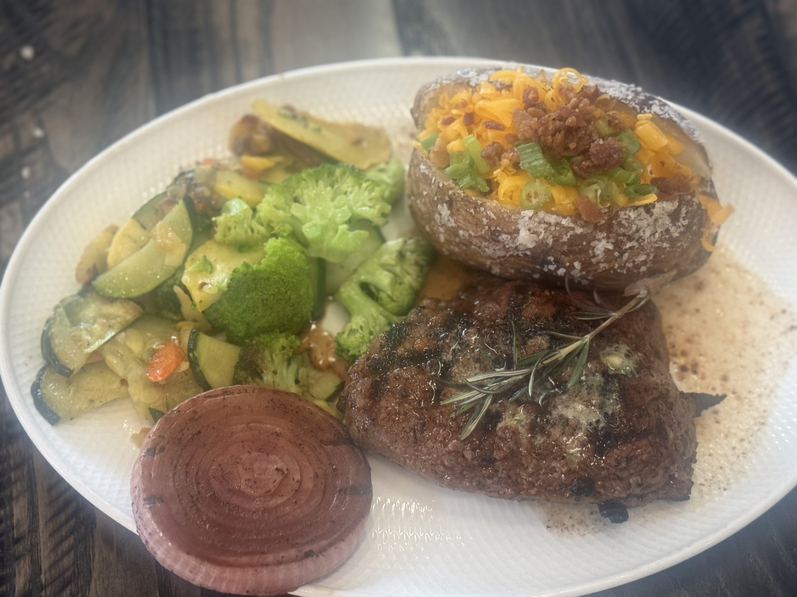 Topped with herb butter and served with grilled sweet onion, loaded baked potato and seasonal vegetables