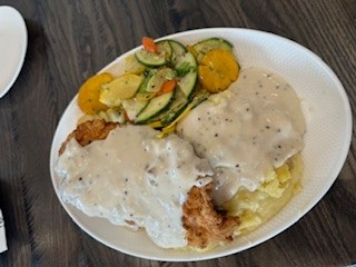 Hand-battered chicken breast smothered with homemade cream gravy served with buttermilk mashed potatoes and seasonal vegetables
