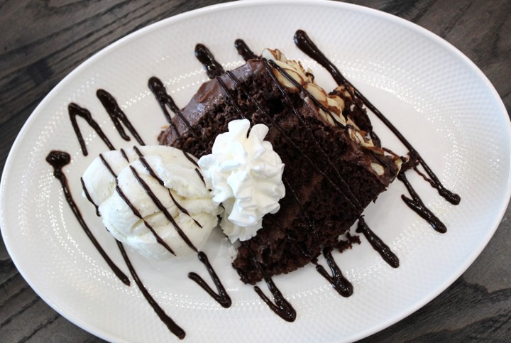 Amaretto devil’s food cake with fudge frosting and ganache, Blue Bell vanilla ice cream and chocolate-covered espresso beans