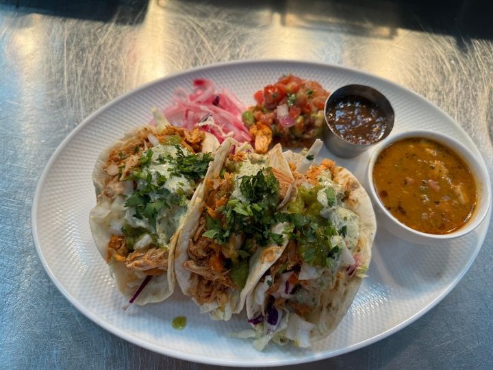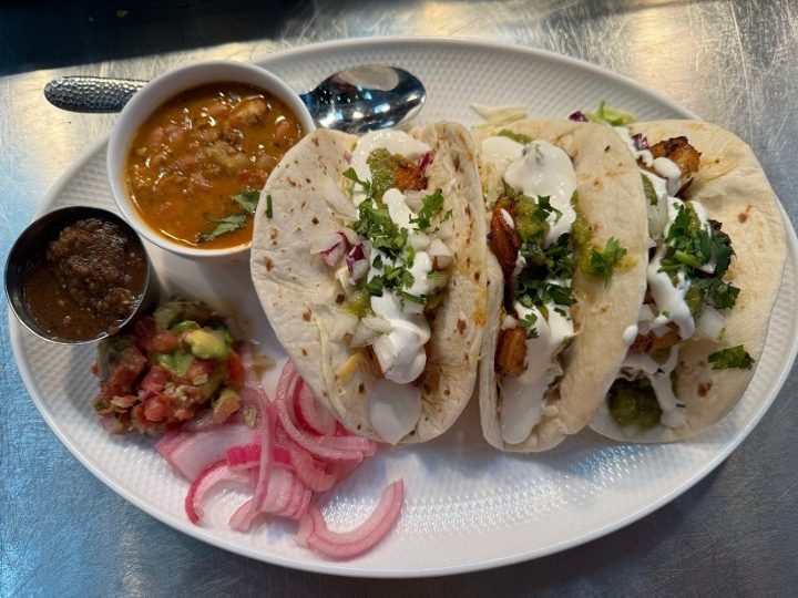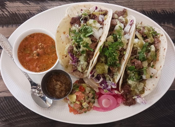 Comes with three tacos. Served on fresh flour tortillas with mango jalapeño slaw, sweet onion, cilantro, charro beans, fire-roasted salsa and avocado pico. Gluten-free corn tortillas available.