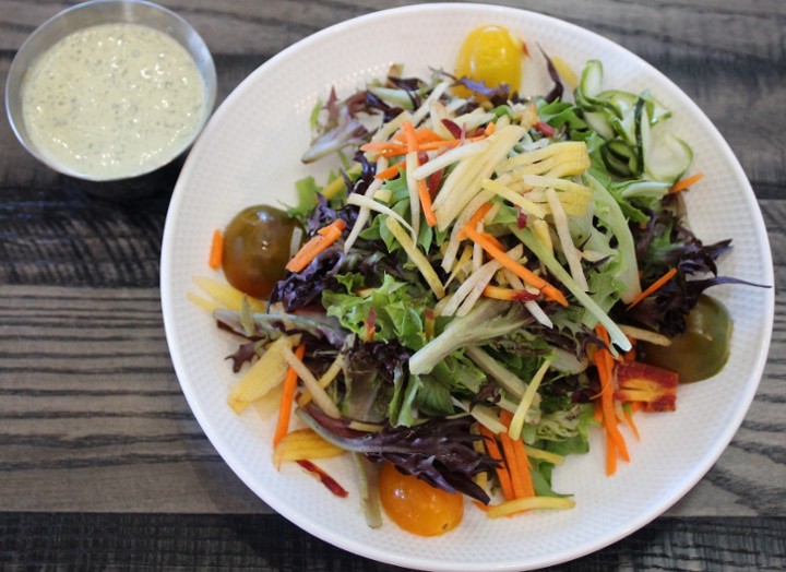Cabbage & romaine with oranges, rainbow carrots, bell peppers and crispy rice noodles in a creamy ginger dressing