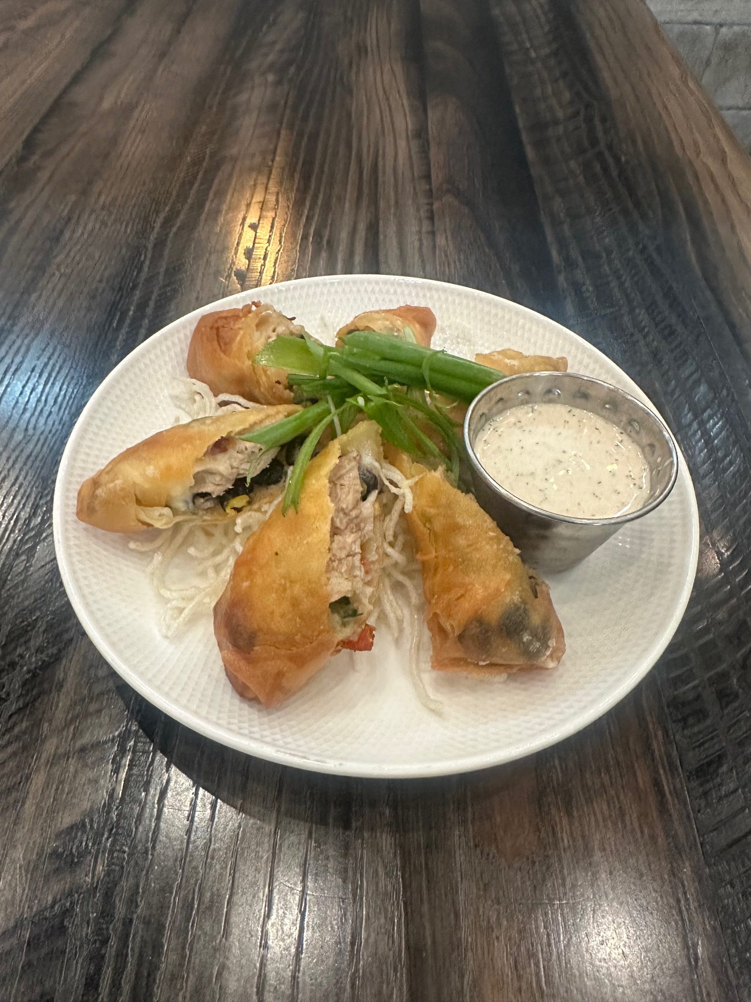 Crispy spring rolls stuffed with slow roasted carnitas, black bean corn relish, Monterey Jack cheese served with southwest ranch.