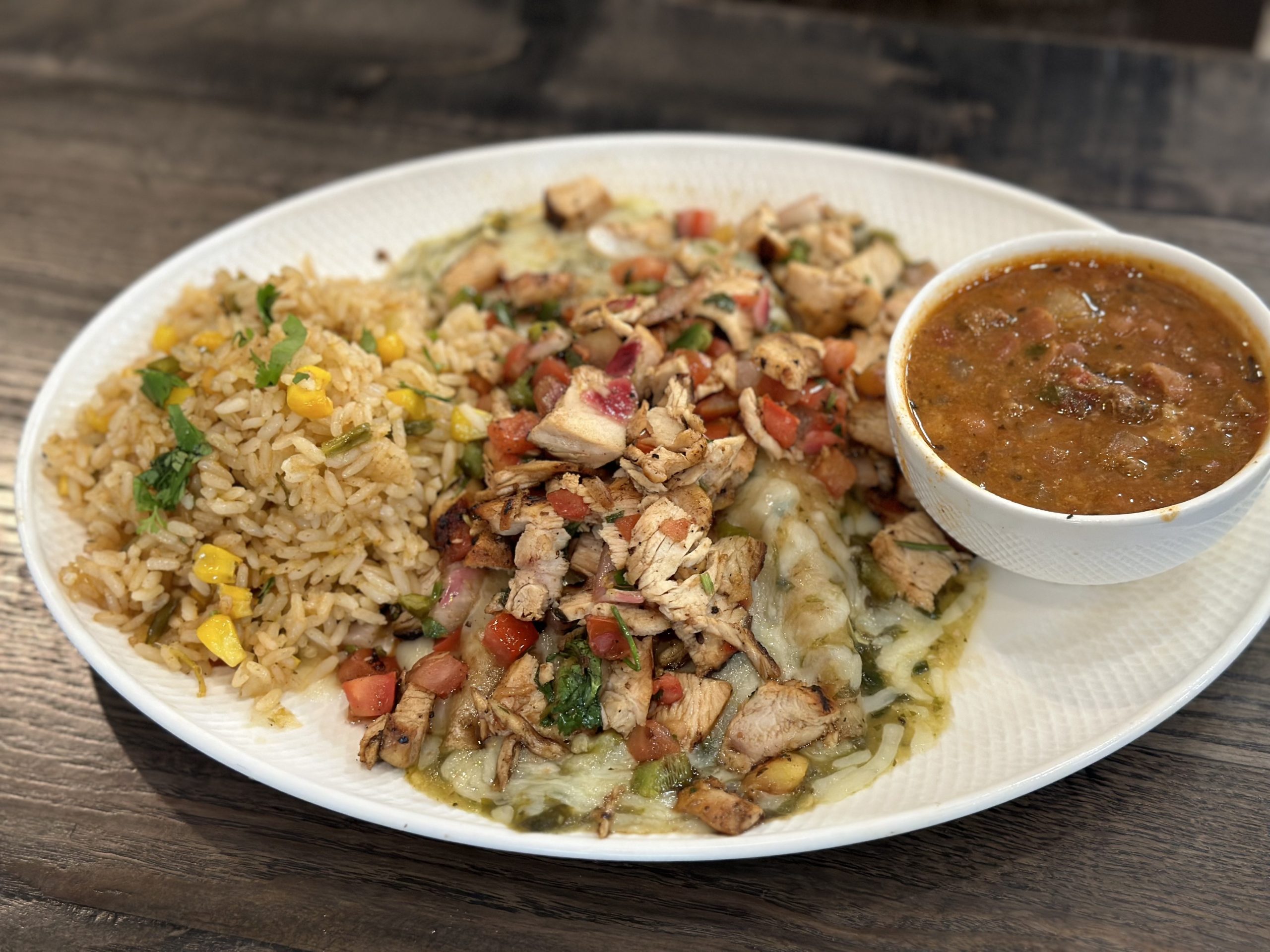 Cheese and avocado stuffed enchiladas topped with grilled chicken, pico de gallo and roasted green chili sauce. Served with southwest rice and charro beans