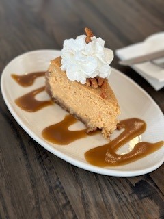 Classic homemade pumpkin cheesecake place on drizzled caramel sauce and topped with whipped cream.