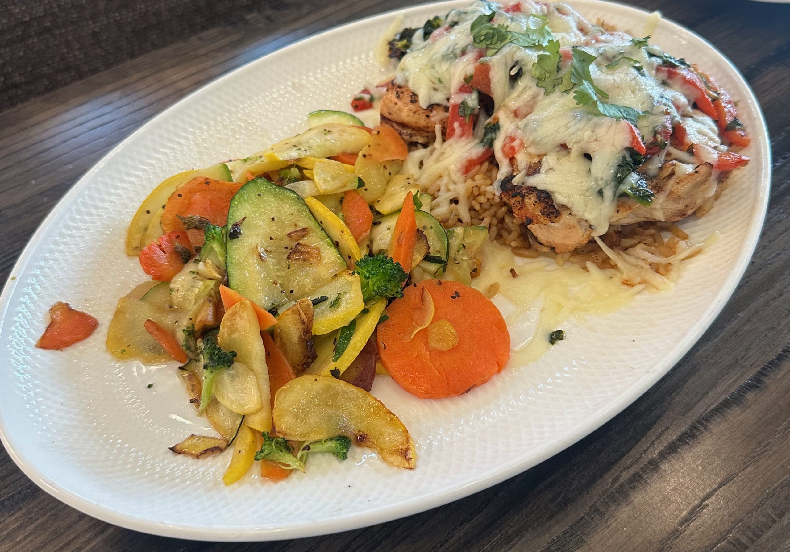 Grilled chicken breast covered with spinach, roasted bell peppers and melted Monterey Jack cheese served over southwestern rice and seasonal vegetables