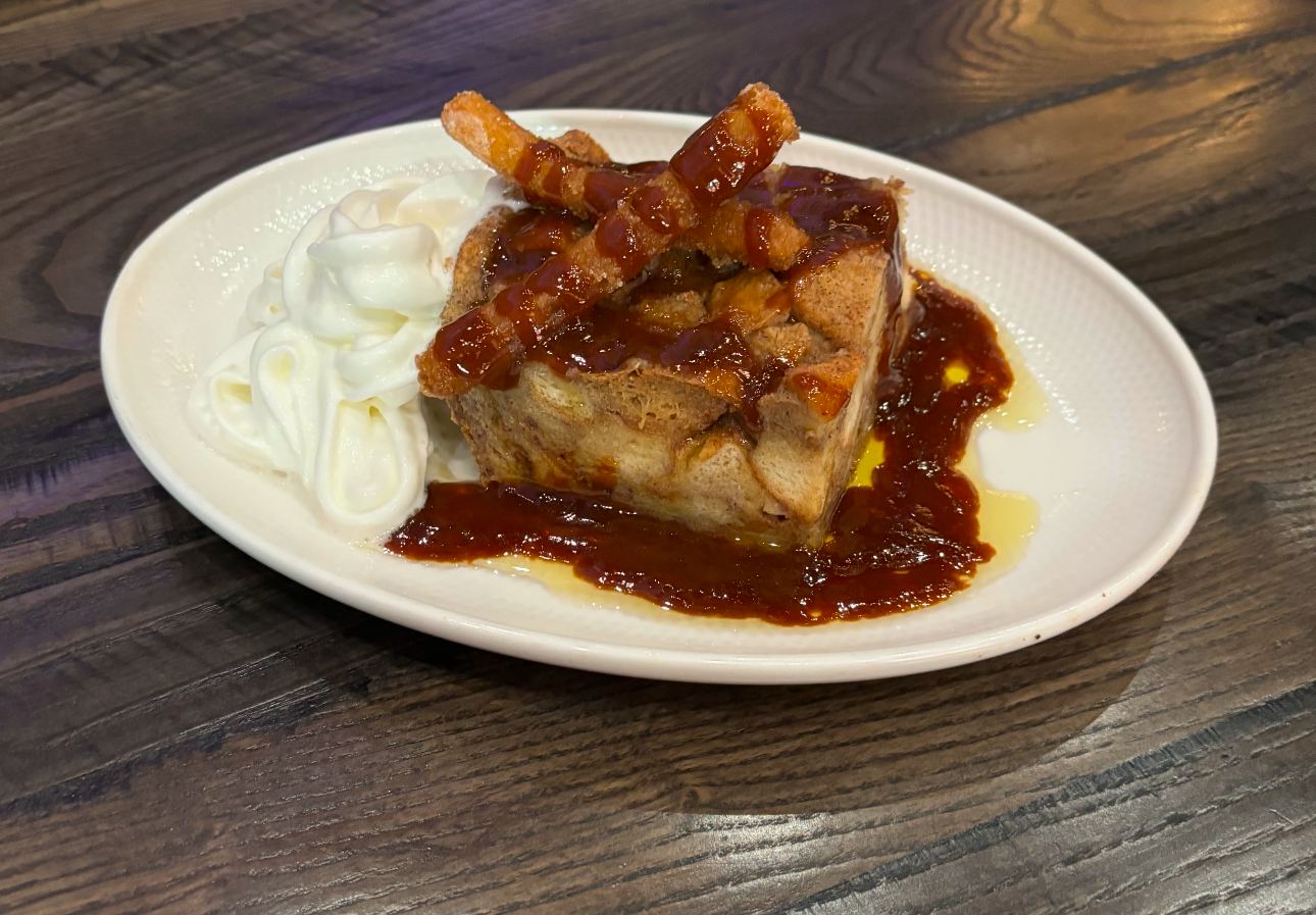 Classic bread pudding with cinnamon churro bites topped with caramel sauce, whipped cream and churro sticks