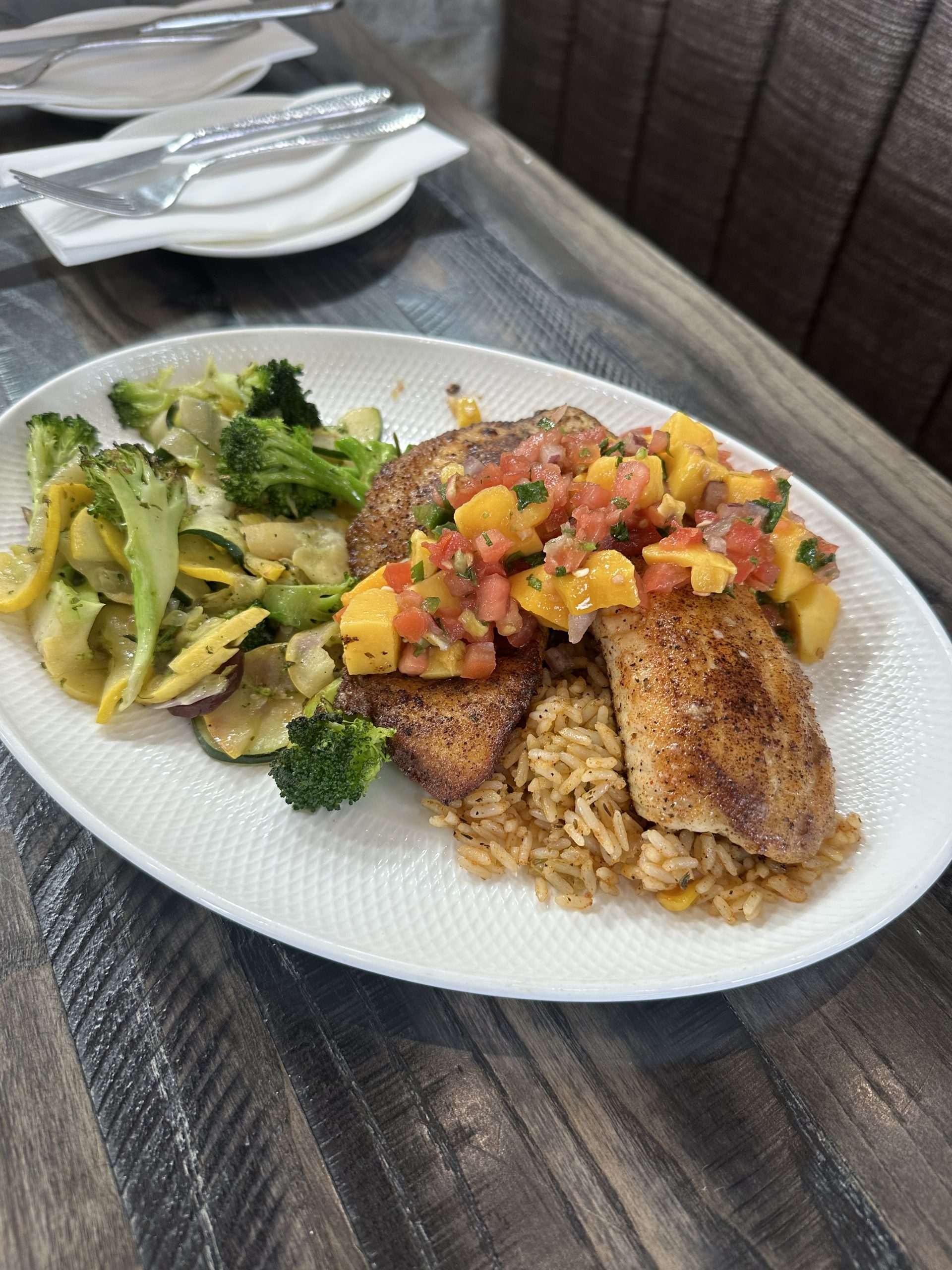 Blackened tilapia on a bed of southwestern rice and topped with fresh mango salsa. Served with sauteed vegetables.