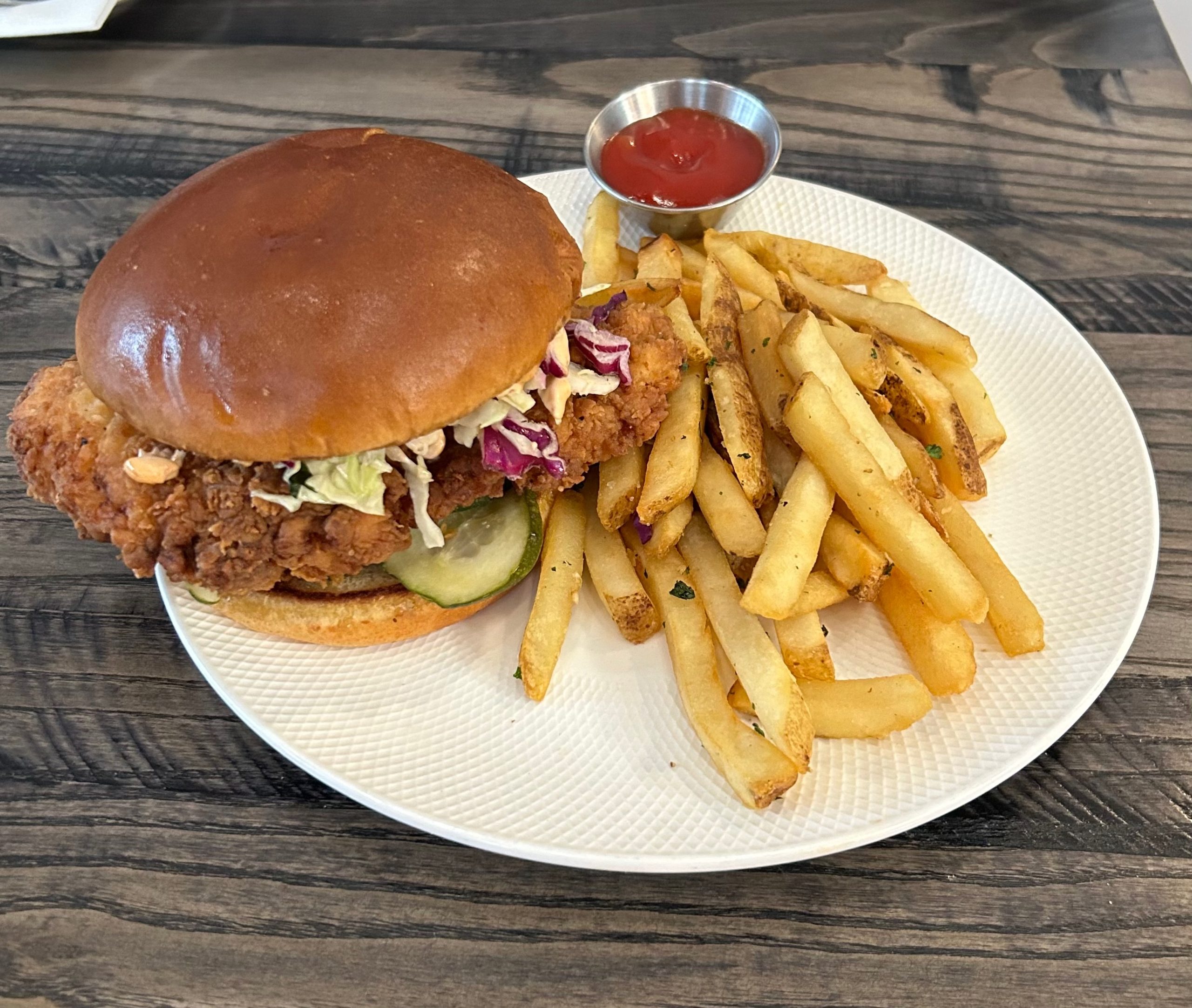 Crispy hand battered chicken breast with mango jalapeño slaw, house-made pickles, smoky fire aioli served with garlic fries.