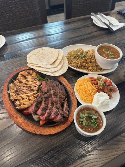 Marinated grilled chicken, steak or grilled shrimp, sautéed onions and peppers. Served with southwestern rice, charro beans, sour cream, guacamole, pico, cheddar cheese, fire-roasted salsa and your choice of corn or flour tortillas.