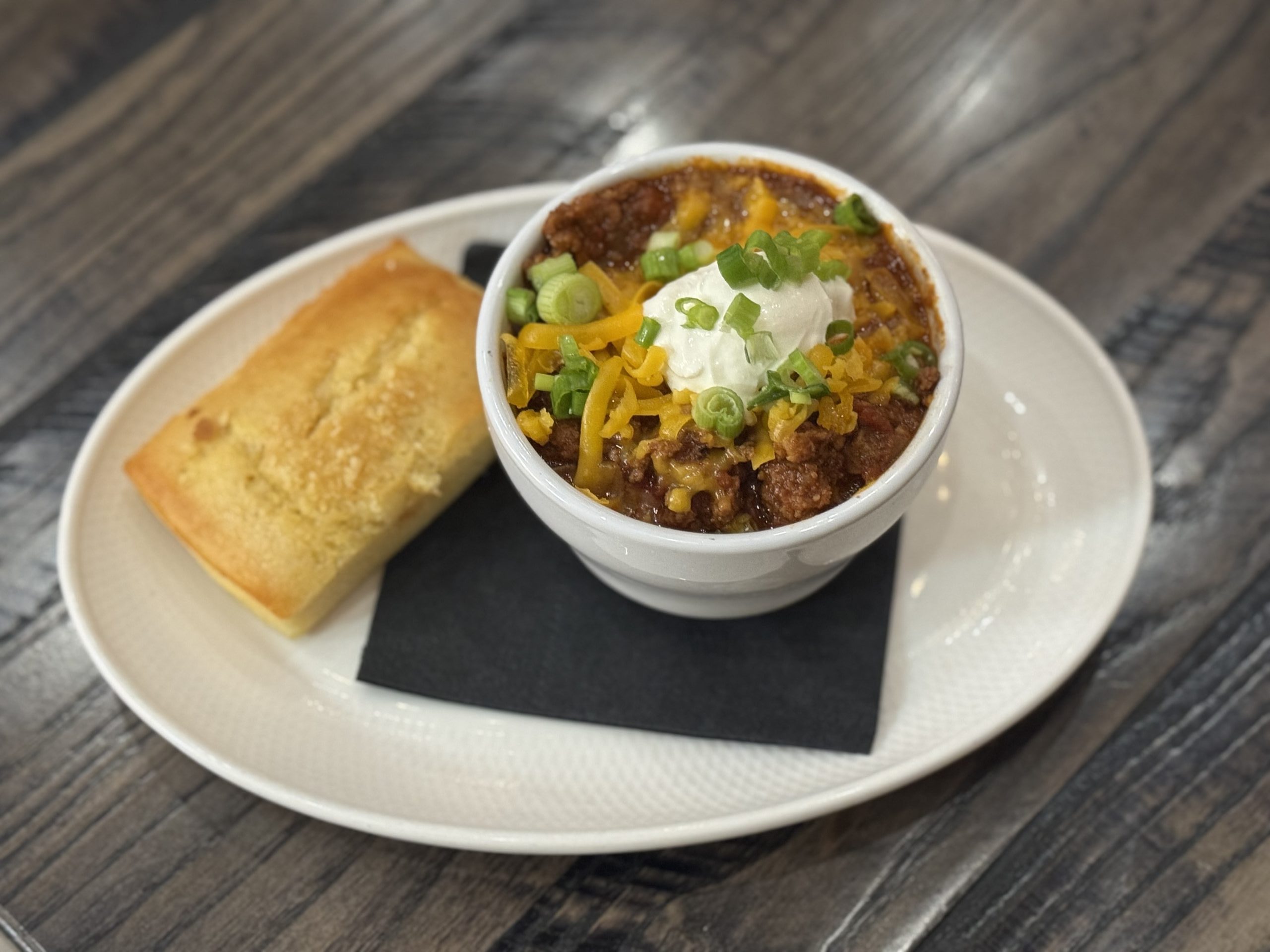 Slow-cooked beef tenderloin chili topped with cheddar cheese, sour cream, and chives