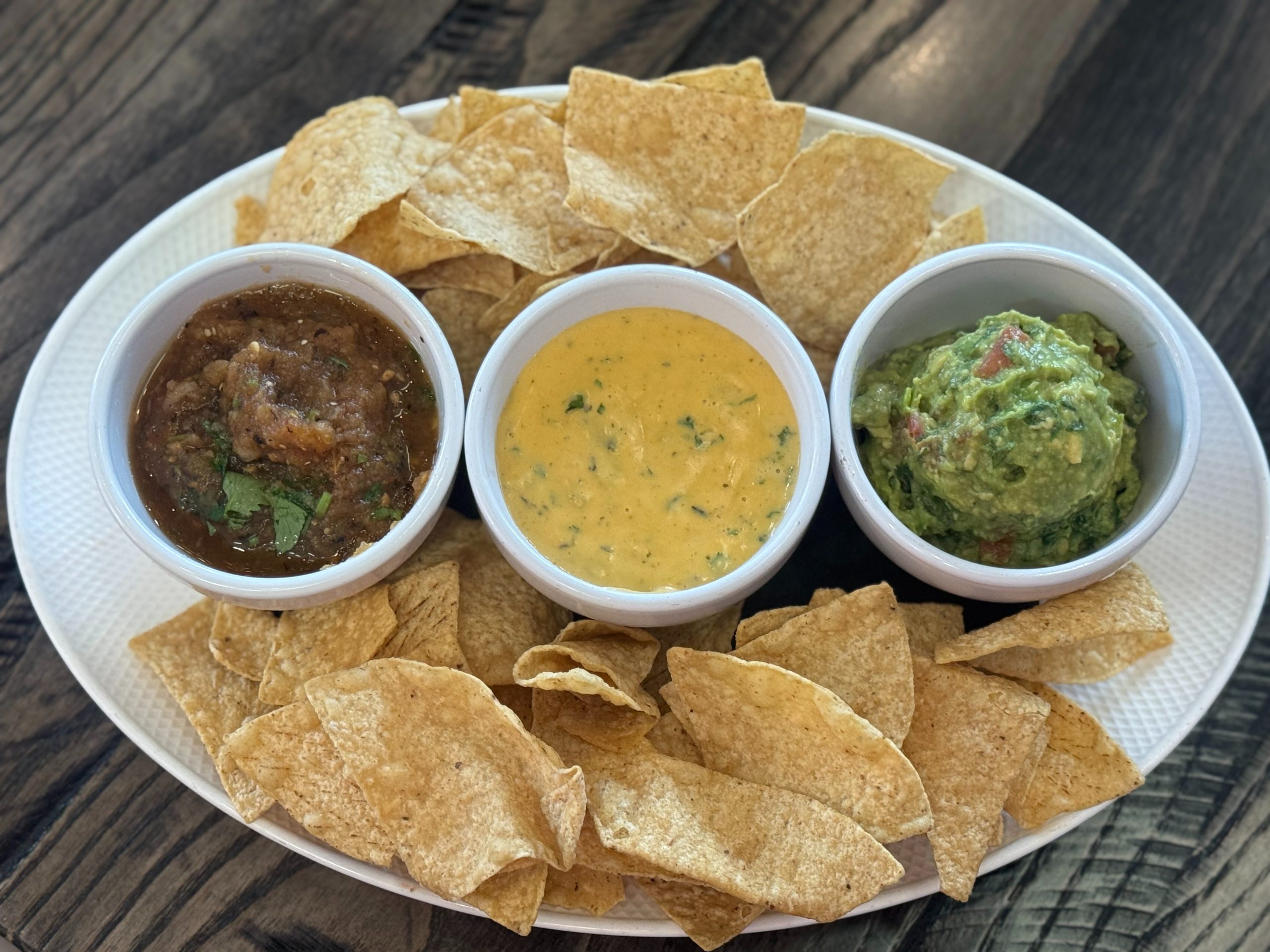 Green chili queso, guacamole and fire-roasted salsa served with tortilla chips.
