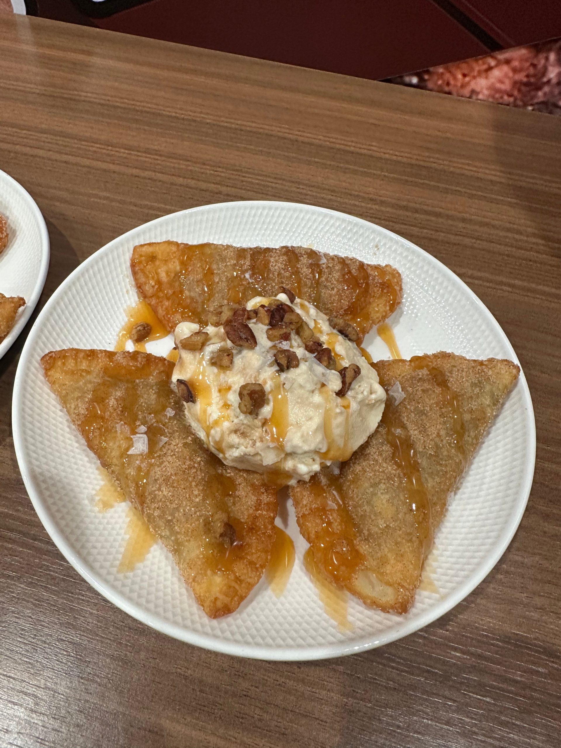 Flaky golden pastry pockets filled with warm cinnamon-spiced apples, dusted with sugar, and topped with caramel and pecan praline ice cream