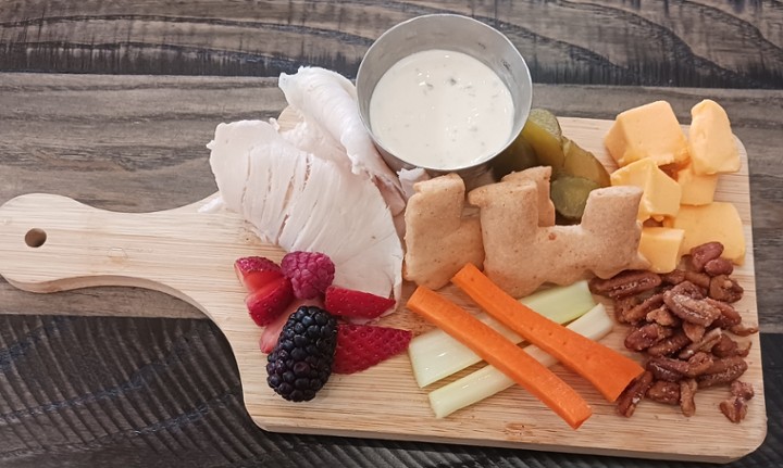 Kids charcuterie with in-house smoked turkey, cheese cubes, pickles, carrots and celery sticks, ranch, fruit, candied pecans and housemade cheddar crackers